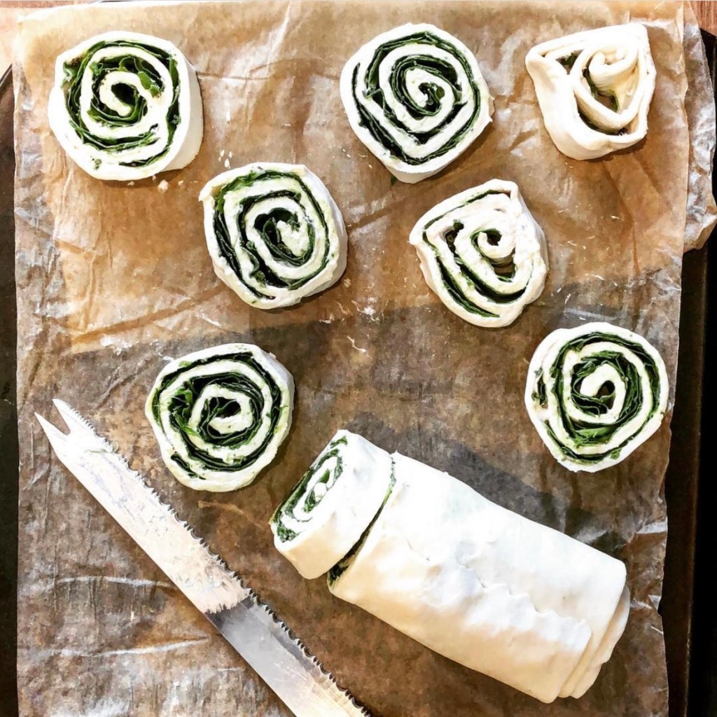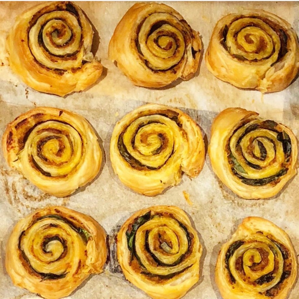 These handy pinwheel pastries are the quickest to make and super tasty. The two main ingredients are (ready rolled) puff pastry and some kind of sauce.