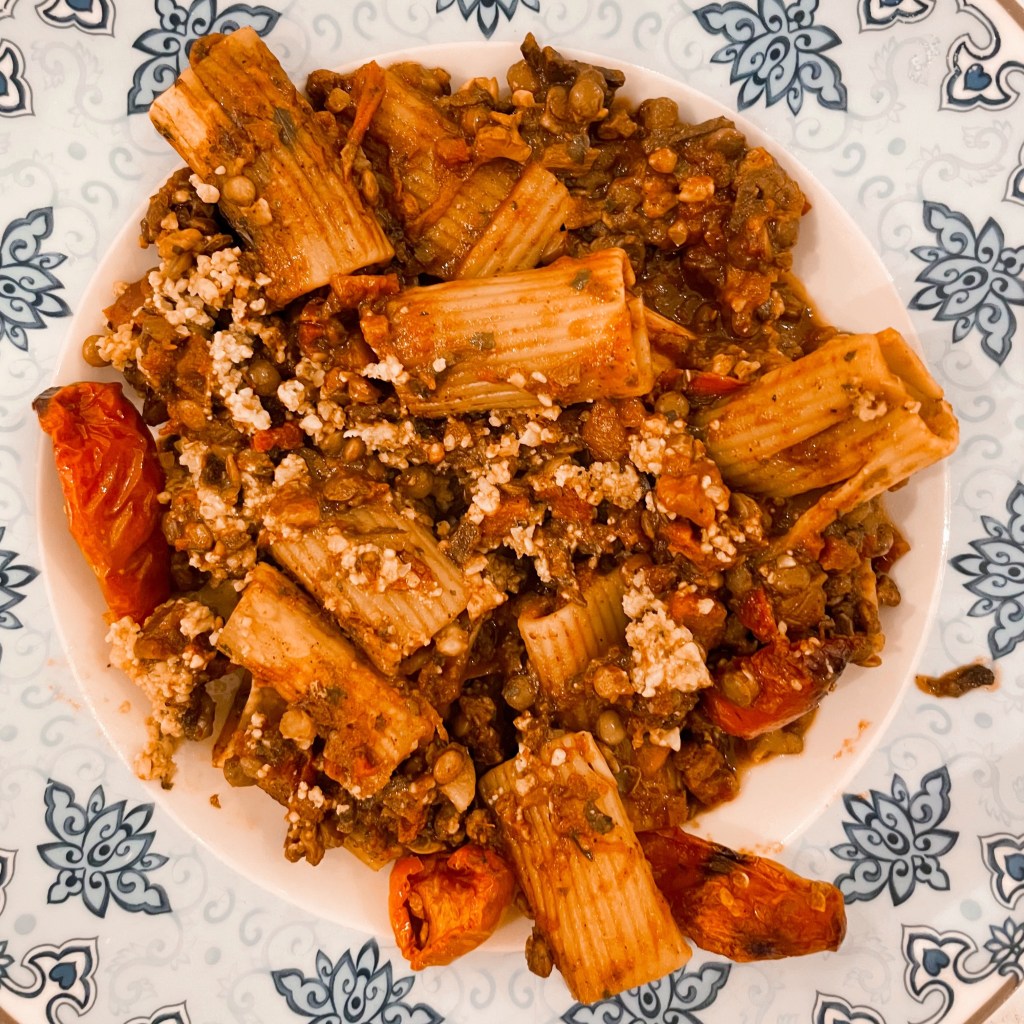 RIGATONI BOLOGNESE > A rich and hearty minced mushroom, lentil and walnut ragu, folded through rigatoni pasta and sprinkled with an almond parm crumb. Now I make a good vegan bolognese so tentatively tried this within an open mind – and pleasantly satisfied. It’s a rich tasty sauce, packing flavour.