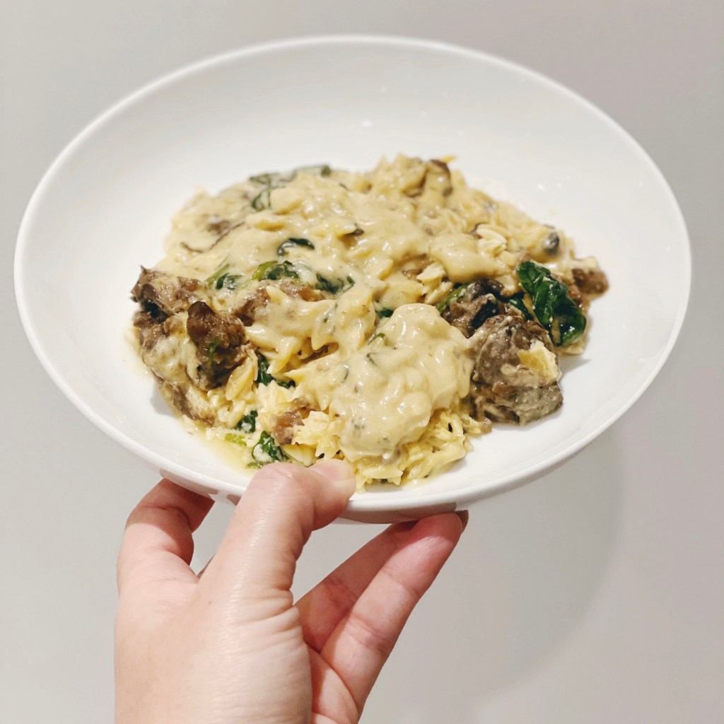 TRUFFLE MUSHROOM ORZO > Orzo tossed in a cashew-based creamy sauce, with chestnut and button mushrooms sautéed with garlic, truffle oil and baby spinach. Umptious creamy risotto style dish but with orzo – really lovely tasting.