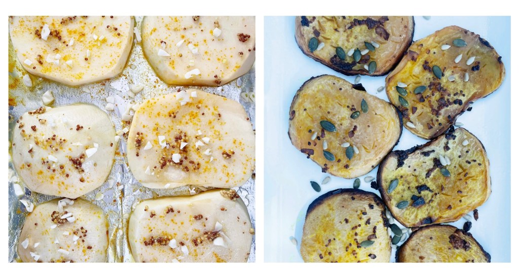 It’s a great dish and handy to be able to prep in advance. A super healthy alternative as the ‘meat’ part of a meal. Swede is packed with vitamin C, E, K and B6, as well as being a good source of manganese, potassium, magnesium, calcium, iron, zinc, carotene and fibre. Not only is it high in vitamin C but also, more importantly, it’s high beta-carotene content helps the body absorb the vitamin more effectively,