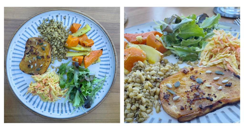 I choose to serve with a selection of different vegetable sides and a grains mix. Butternut squash and parsnips were roasted in onion, cumin, tumeric, salt, pepper and chia seeds, fresh salad tossed with balsamic dressing and a homemade vegan coleslaw made with Heinz vegan salad cream and mayonnaise, with a little pepper.