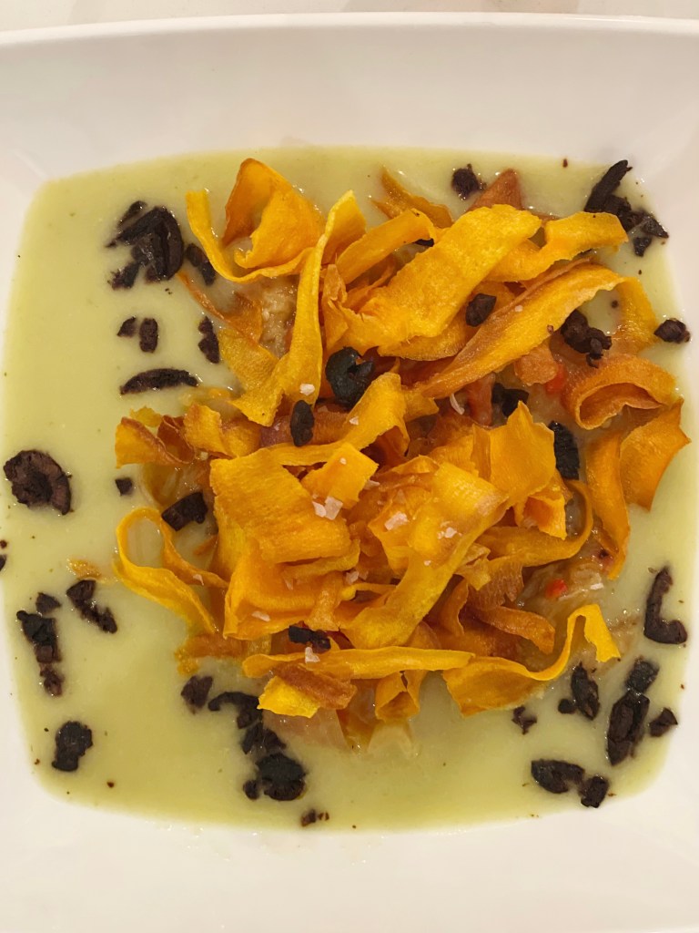 Escalivada with olive tapenade and casava crisps (grilled vegetables)