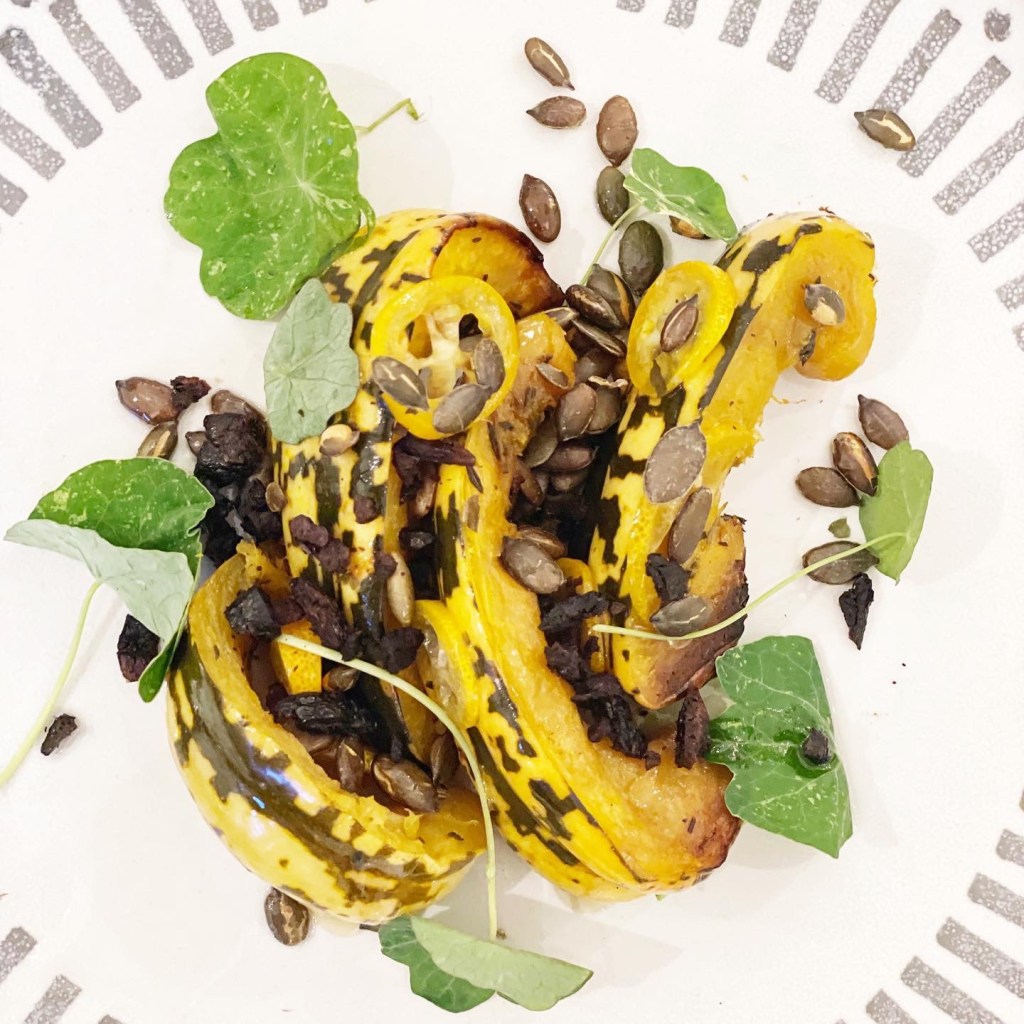 Pumpkin Asada (a dish with labneh, seeds, nasturtium leaves and kumquat)
